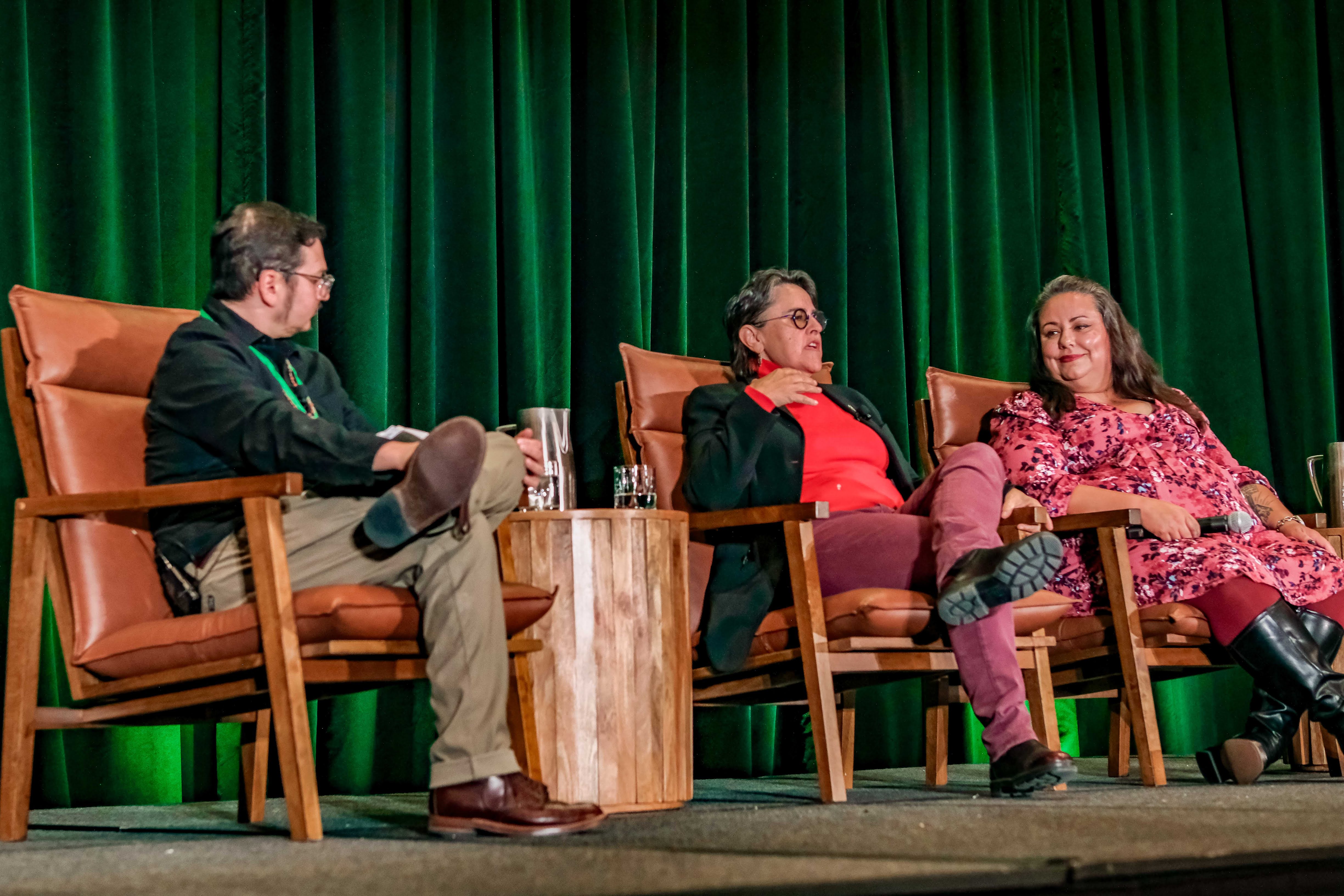 [From left to right: Louis Gordon, EGA Board Vice Chair and Program Director at the Seventh Generation Fund for Indigenous Peoples, Camilla Bustamante, Santa Fe County Commissioner and Andrea Serrano, Executive Director of OLÉ (Organizers in the Land of Enchantment)]